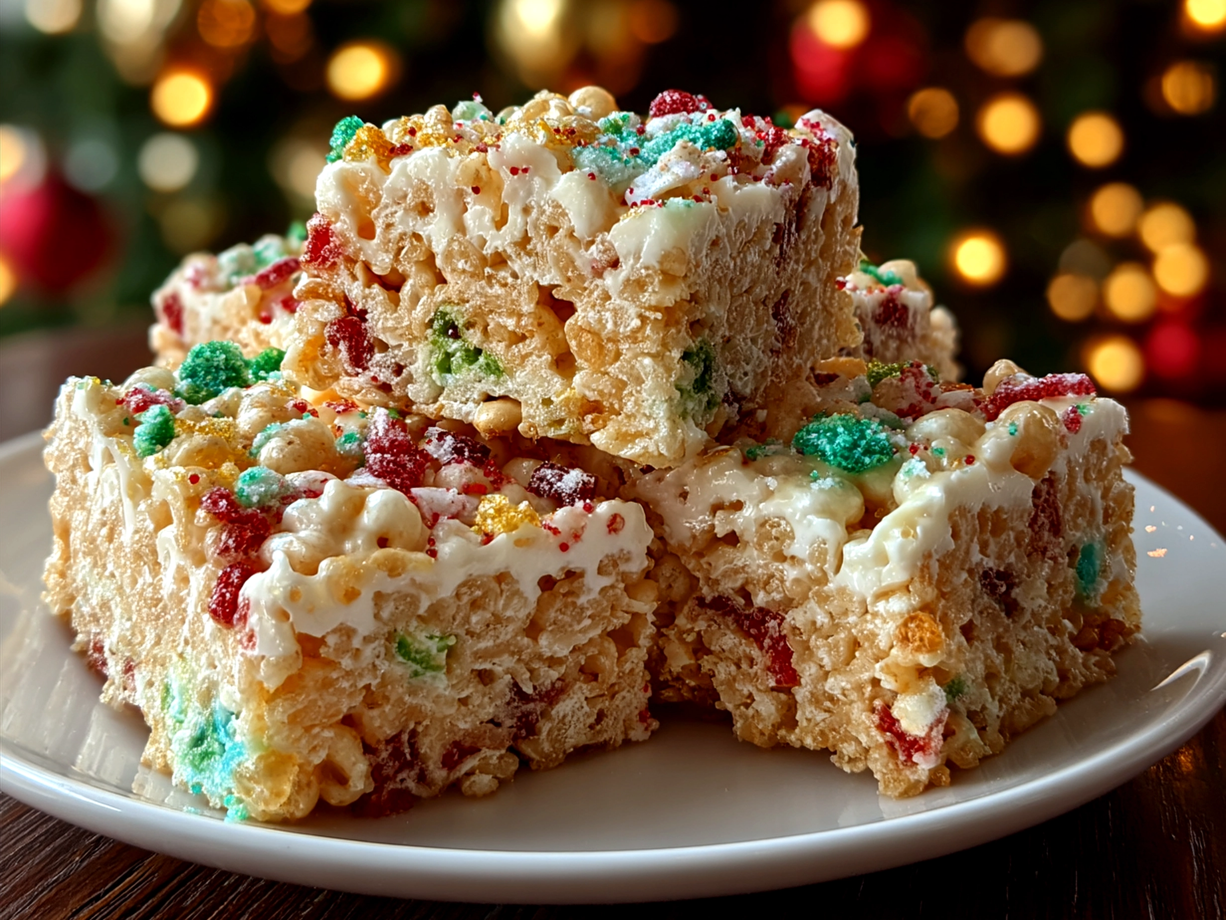 Festive and chewy Christmas Rice Crispy Treats made with marshmallows and colorful holiday sprinkles, perfect for a quick and joyful holiday snack.