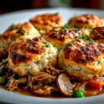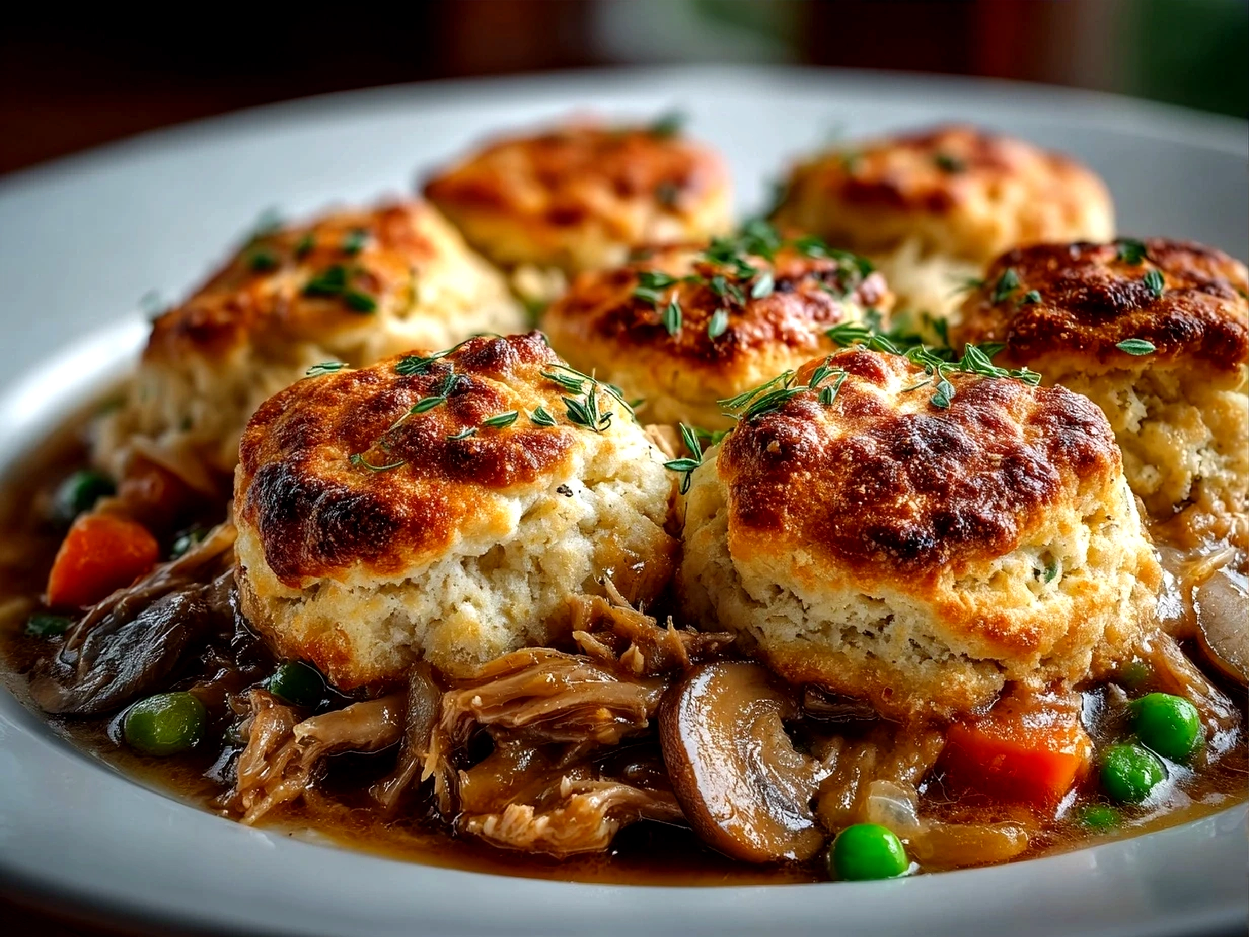 This hearty Turkey Pot Pie with Biscuit Topping combines tender turkey and vegetables in a creamy sauce, topped with fluffy homemade biscuits for a comforting, classic meal.